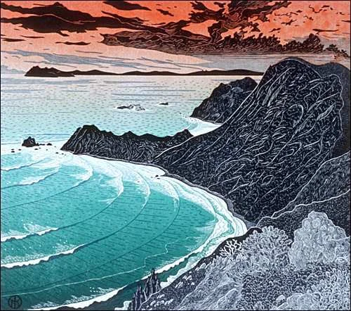 Printing History: Right side of new Carmel Bay diptych completed Dec. 2014. Multi-block reduction cut with 16 color layers, ed. of 175 plus artist's proofs. Still available in matched sets above ed. #112 and in single numbers above 136.